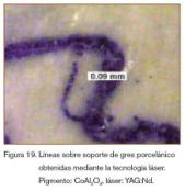 Gracias al reducido tamaño de foco del láser se han podido trazar líneas de grosor inferior a 100 µm (figura 19). El hecho que la capa del pigmento queda bien adherida al soporte permite recuperar el precursor no reaccionado mediante soplado. Todos los pigmentos obtenidos consisten en granos de tamaño inferior a 200 nm aglomerados en partículas de mayor tamaño.