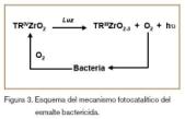 El mecanismo del fenómeno bactericida, de forma simplificada, se basa en una reacción fotocatalizada por la luz al incidir sobre el esmalte. Cuando la luz incide sobre éste, provoca un cambio en la constitución de la tierra rara (reducción de estado de oxidación IV a III), que a su vez genera un cambio en la estructura de la disolución sólida. Esta nueva estructura (TRIIIZrO2-d) requiere menos oxígeno que la anterior, por lo que el oxígeno extra, se libera e interacciona con el citoplasma de la bacteria, provocando su muerte. De forma esquemática, el mecanismo puede simplificarse como se indica en la figura 3, por lo que debido a la naturaleza del fenómeno bactericida, no se cuestiona su durabilidad con el tiempo, ya que se trata de un proceso de características fotocatalíticas.