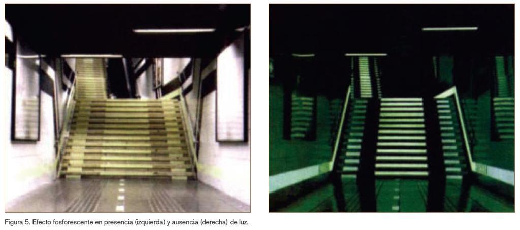 Aplicando este concepto a las baldosas cerámicas, se puede entender como la obtención de baldosas con propiedades fosforescentes abre múltiples aplicaciones, desde su utilización como marcas de rutas de escape en espacios oscuros en caso de cortes en el suministro eléctrico, hasta las grandes posibilidades decorativas que dicho fenómeno posibilita (figura 5).