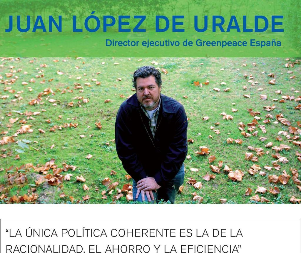 En el mundo hay una bandera que enarbolan las personas comprometidas con la defensa del medio ambiente. Esta enseña luce los colores del arcoíris y se despliega por todo el mundo para denunciar los atentados contra los mares, ríos y montañas. Inmerso en esta causa, no exenta de descalificaciones, se encuentra Juan López de Uralde, director ejecutivo de Greenpeace España. Habla con nostalgia de sus primeros años de militancia ecologista, allá por los ochenta, pero su discurso se vuelve amargo cuando acusa a la clase política de falta de sensibilidad para actuar contra el cambio climático. Y entre el ayer y el hoy se cuela un esperanzador mañana que nos lleve a comprender que los recursos naturales son escasos y valiosos, y que la lucha por conservarlos merece la pena.