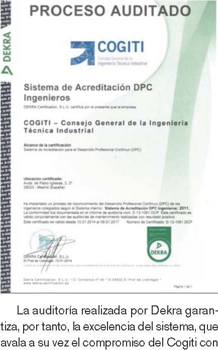 La Acreditación DPC Ingenieros del Cogiti ha obtenido la certificación de su sistema de gestión, expedido por el organismo independiente Dekra Certification, al cumplir los criterios de procedimiento y funcionamiento óptimos en el reconocimiento del desarrollo profesional continuo. La auditoría de dicha entidad certificadora ha determinado que las actividades y los resultados relativos a la calidad cumplen las disposiciones establecidas previamente en la normativa del Sistema DPC, que a su vez han sido implantadas de forma efectiva y adecuada para alcanzar los objetivos marcados.