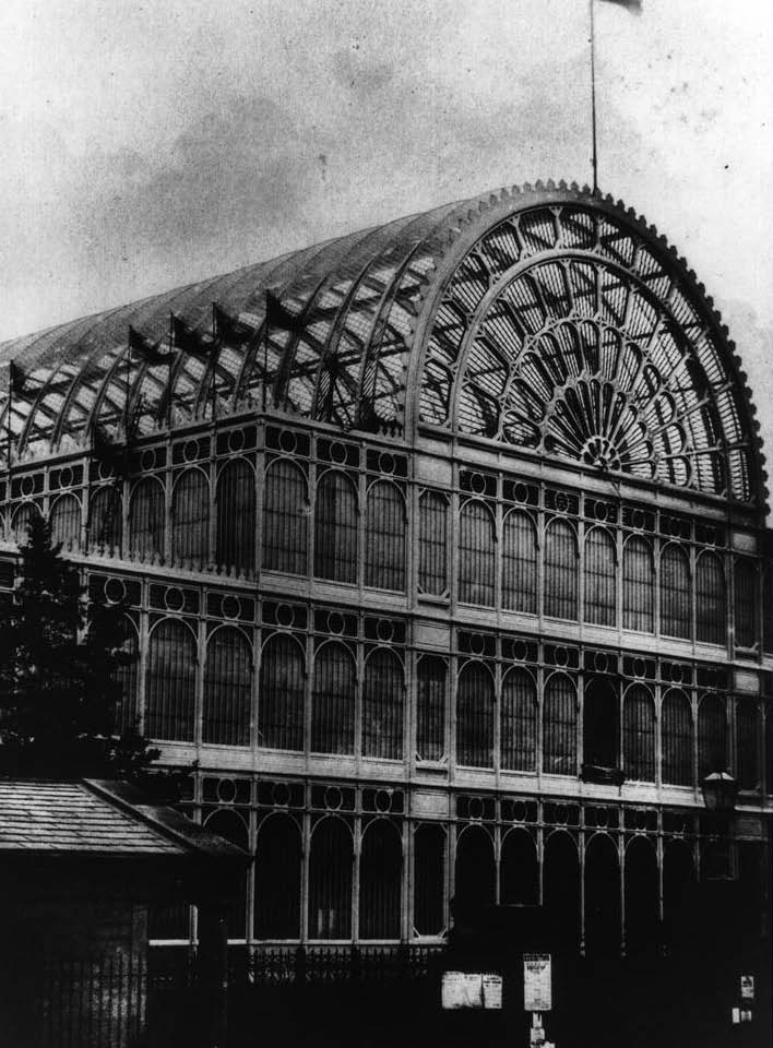 El hierro y el vidrio fueron los elementos claves del que fue el primer gran ejemplo de edificio prefabricado. El Crystal Palace, instalado en Hyde Park, medía 563 metros de largo por 124 de ancho y ocupaba una superficie superior a 70.000 metros cuadrados. Su altura alcanzaba los 41 metros. Constaba de 3.300 pilares de hierro, 2.224 viguetas y 300.000 vidrios sostenidos por 205.000 marcos de madera. Se consideró una de las grandes maravillas de la arquitectura de su tiempo, que además albergaba numerosos jardines, fuentes y cascadas. Finalizada la exposición, se desmontó en 1854 y se volvió a montar en Sydenham Hill, zona del sur de Londres, hasta que un incendio ocurrido el 30 de noviembre de 1936 lo destruyó en pocas horas.
