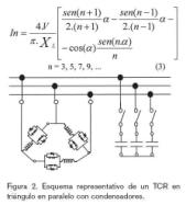 Debido a la presencia del tercer armónico y de sus múltiplos, se suele montar el TCR en triángulo (figura 2) en lugar de en estrella, con la finalidad de que estos armónicos circulen por el triángulo y no aparezcan en la corriente de línea.