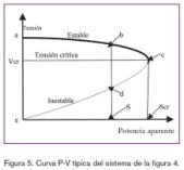 c2 = a2+b1Bc válida la solución real y positiva. Una curva típica del sistema (con Bc = 0),  para un factor de potencia de la carga constante, se puede ver en la figura 5. Los puntos “a” y “e” de la citada figura, representan las condiciones de circuito abierto y de cortocircuito, respectivamente, y el punto “c” representa el punto crítico de la curva P-V. La tensión y la potencia en el punto “c”, se denominan tensión crítica (Vcr) y potencia aparente crítica (Scr). Para valores de potencia mayores de Scr (S>Scr) no existe solución para la tensión VR, mientras que para valores menores que Scr (S<Scr) existen dos soluciones: una estable (punto “b”) y otra inestable (punto “d”). Se observa que si la carga se incrementa, la solución estable (línea gruesa) se reduce, mientras que la solución inestable (línea fina) se incrementa y en el punto “c” ambas soluciones coinciden.