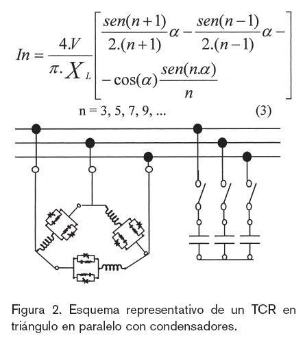 Actuando sobre el ángulo de disparo de los tiristores se puede modificar la componente fundamental de la corriente absorbida y, por lo tanto, varía la potencia reactiva absorbida. La ecuación (1) expresa la potencia reactiva por fase: