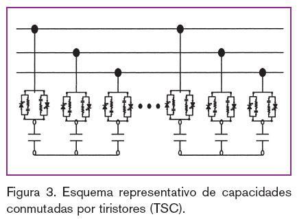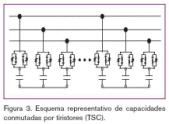 Las capacidades conmutadas por tiristores (TSC), se basan en la conexión o desconexión de bancos de condensadores a la red, a través de dos tiristores conectados en antiparalelo, que actúan como interruptores bidireccionales (figura 3).