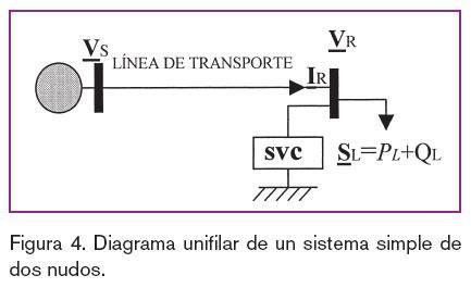 A continuación se determina el límite de estabilidad de tensión de un sistema simple de dos nudos en uno de los cuales se ha conectado un SVC (figura 4).