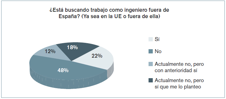 Ante la sensación de que todavía tiene que mejorar sustancialmente la situación laboral, el 80% de los ingenieros encuestados estaría dispuesto a trabajar fuera de España, en cualquier país que pueda ofrecerles una oportunidad para desarrollar su carrera profesional. A pesar de ello, casi la mitad de los encuestados no está buscando actualmente empleo en el extranjero, aunque el 12% sí reconoce haberlo hecho en el pasado y el 18% suele planteárselo en alguna ocasión.