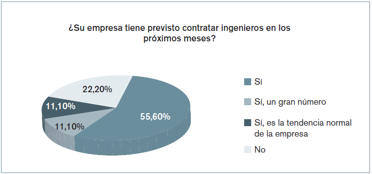 En el caso concreto de las empresas encuestadas, el 77,80% indicó que tenía previsto contratar ingenieros en los próximos meses, siguiendo la tendencia habitual de la compañía y las buenas previsiones del mercado de trabajo en el ámbito de la ingeniería.