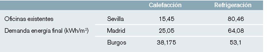 De acuerdo con dicho documento, los valores de demanda obtenidos para edificios de oficinas en las zonas climáticas más semejantes a aquellas en las que se encuentran los C-DdI serían los que refleja la tabla 1.