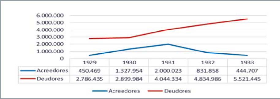 La España industrial entre 1929 y 1933 tuvo un margen de maniobra limitado por varias razones. Primero, por culpa de las deudas que tuvo la empresa en esos años. Entre 1930 y 1932 la empresa tuvo un problema con los acreedores, sobre todo en 1931 con 2.000.023 pesetas27. Entre 1929 y 1933 las deudas debidas fueron una mala noticia para la empresa ya que fueron aumentando de 2.786.435 pesetas en 1929 a 5.521.445 pesetas en 1933 (figura 3).