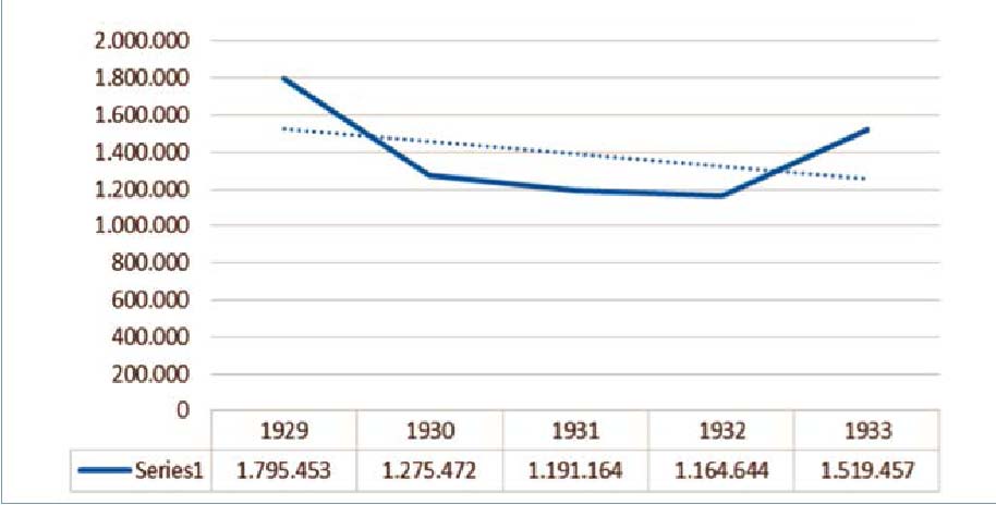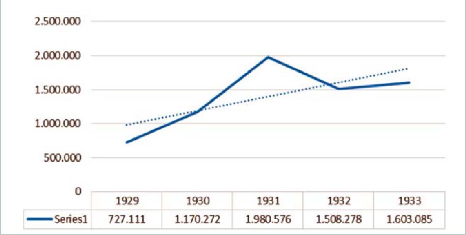 Segundo, otro problema que tuvo la empresa entre los años 1929 y 1933 fueron los beneficios de la España industrial, demasiado exiguos. En 1929 los beneficios fueron de solo 1.795.453 pesetas y disminuyeron en 1932 a 1.191.164 pesetas, años en los que solo existió un pequeño repunte en 1933 con 1.519.457 de pesetas28 (figura 4).