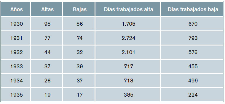 Es decir, una pérdida total de 65 de trabajadores en una media constante de 13 empleados en 5 años, un número insignificante y la Guerra Civil impide analizarlo con certeza. En cambio, si exponemos en el cálculo las nuevas 800 unidades mecánicas que se transformaron en la empresa a partir de los viejos telares en la reforma de la sección de hilados podríamos ver que: