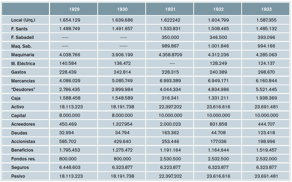 En la España industrial hubo varias maneras de solucionar el problema financiero de la empresa como fueron, por un lado, la ampliación del valor patrimonial, con la compra de la fábrica de Sabadell y, por otro lado, la de diversificación de la producción con la entrada de un nuevo artículo como fue el mohair en la línea comercial de la empresa. Estas soluciones solo fueron a corto plazo, ya que los problemas de la España industrial eran organizativos. En los balances de la empresa había graves señales de sobreproducción. Este empobrecimiento de la empresa entre 1929 a 1933 fue solventado en un término cercano por el uso de las líneas de crédito al abrirse nuevas líneas bancarias desde 1932 hasta 1933 con un valor de 1.938.369 pesetas. El dinero en efectivo, entre 1929 y 1933, siempre fue en general de poca importancia32.