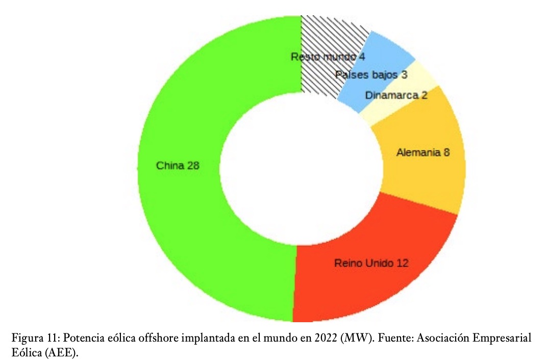 En todo el mundo, a finales de 2022 la potencia eólica offshore era de unos 57 GW, y los países con más aerogeneradores marinos implantados eran China (28 MW), Reino Unido (12 GW), Alemania (8 GW), Países Bajos (3 GW) y Dinamarca (2 GW), como se puede ver en la figura 11.
