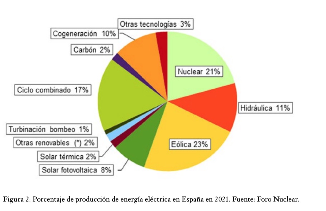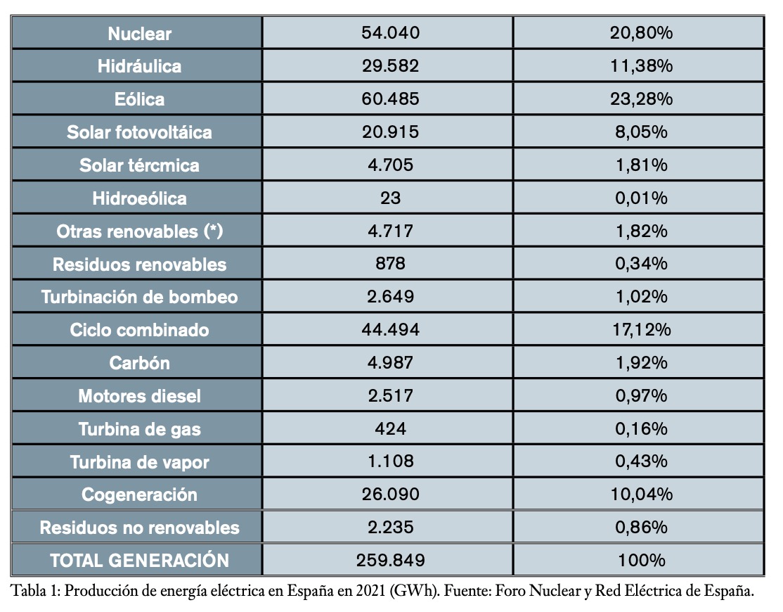 En 2021 la energía eólica generaba unos 60.000 MWh cada año, y era el origen del 23 % de la energía eléctrica que se producía en España, como se puede ver a continuación (Tabla 1 y Fig. 2).