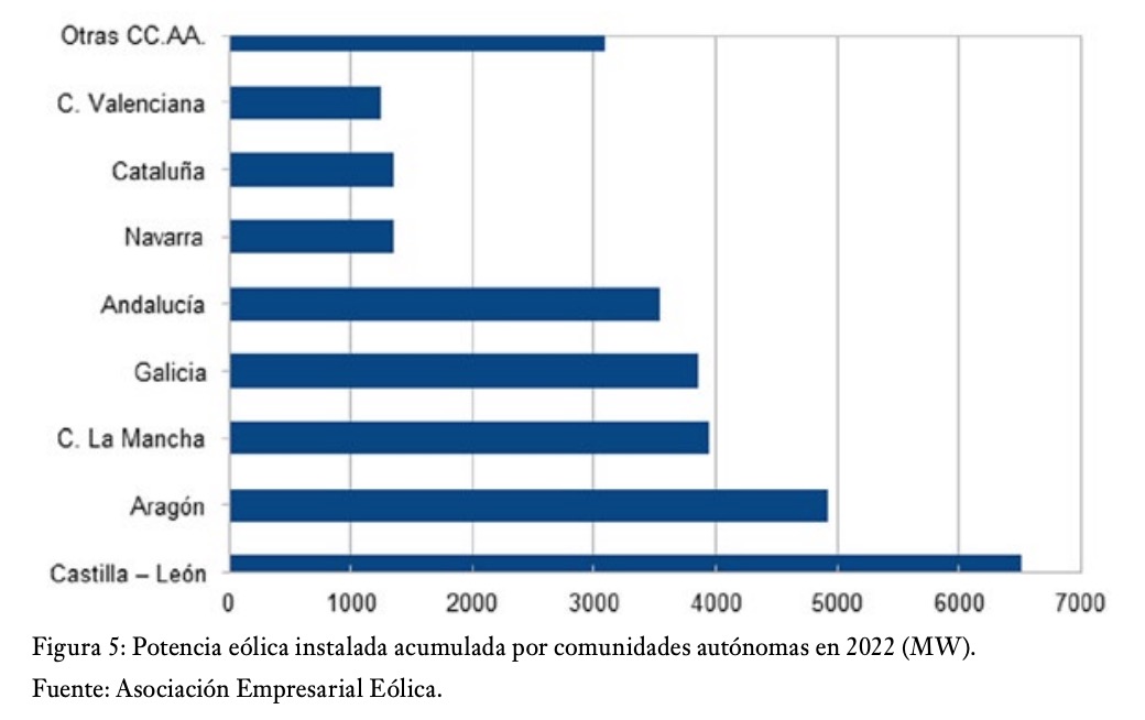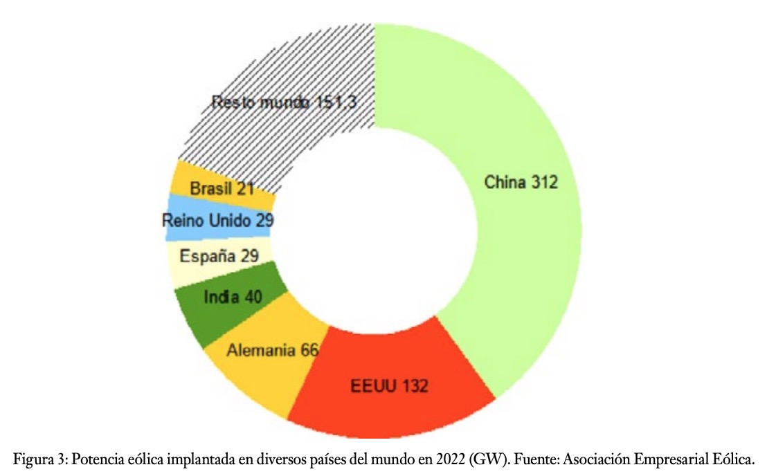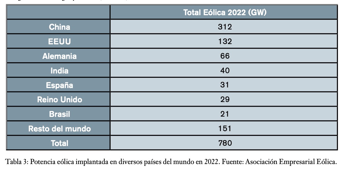 España es el quinto país del mundo con más potencia eólica instalada con alrededor del 4% de la potencia implantada de todo el mundo, y el segundo de Europa, solo superado por Alemania. Se puede ver en la tabla 3 la implantación de potencia eólica total (terrestre y offshore) a final de 2022 en diferentes países.