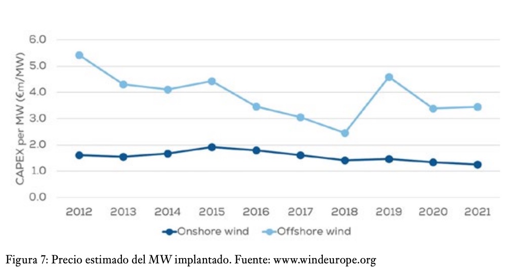 • El recurso eólico disponible es mucho mayor. El PNIEC estima que mientras que el funcionamiento equivalente en tierra está entre las 2.100 horas y 2.500 horas el recurso eólico es del orden del 35% mayor, y se dispara hasta unas 3.100 horas al año, e incluso podría mejorarse tecnológicamente, ya que no es una tecnología tan madura como la tecnología terrestre. Además, el régimen de viento es favorecedor a la eólica offshore (tiene menos rugosidad), ya que en el mar no hay obstáculos, de forma que para alcanzar velocidades mayores no es preciso elevar tanto el buje como en la costa. El coste de implantar un parque eólico marino es mucho mayor que en tierra. Se trata de un precio muy variable, pero siempre superior a los precios de la costa. La Asociación Eólica Europea estima un coste en torno a 1,2 €/MW para la eólica en tierra y de unos 3,5 M€/MW en la offshore, aunque los parques eólicos flotantes (mucho más caros) pueden llegar a los 5 M€/MW instalados (Flores Baena, 2022). En la figura 7 se puede ver la evolución del precio medio de un parque eólico en tierra y marino en M€/MW.