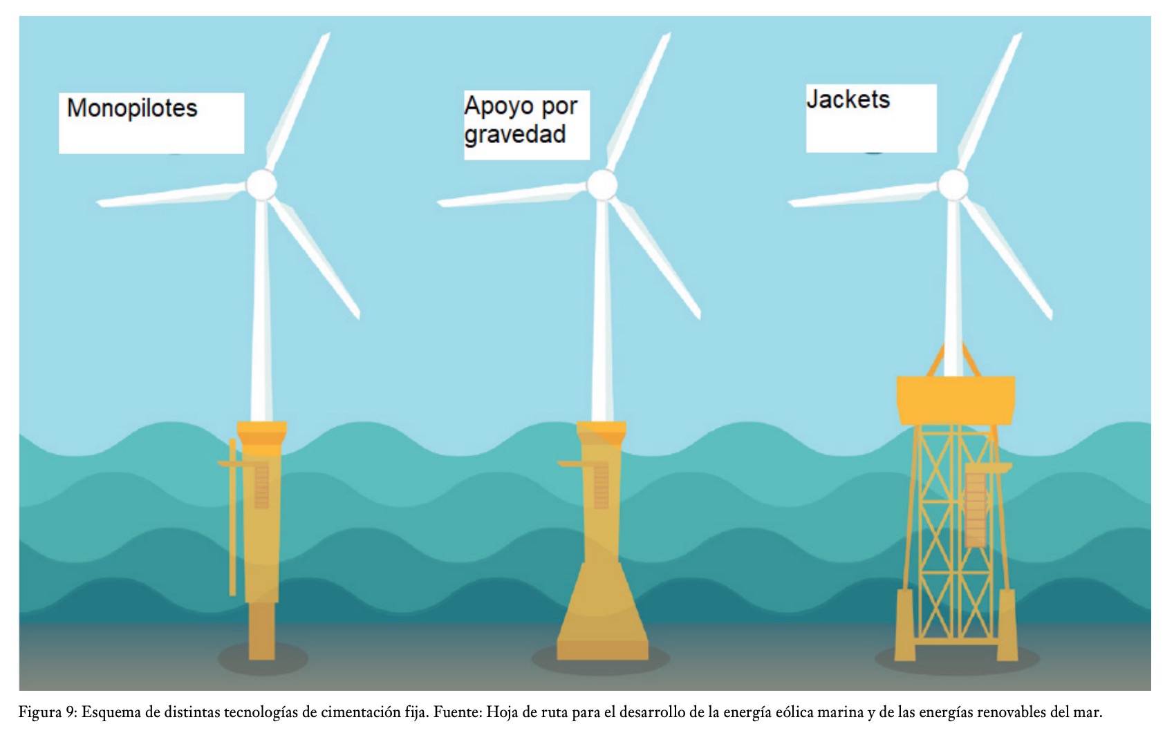 • Hay dos tecnologías, como son los parques eólicos fijados a la plataforma marítima y los parques eólicos flotantes. Los parques eólicos fijados a la plataforma marítima tienen tres modalidades, que son los monopilotes (de hasta 15 m de profundidad), los apoyos por gravedad (entre 15 m y 60 m) y, los jackets (entre 30 y 60 m), mientras que los parques flotantes deben ir anclados al fondo marítimo, aunque se permite una profundidad hasta unos 1.000 m; en la figura 9 se ve un croquis de cada uno de los tres tipos de parques fijados a la plataforma.