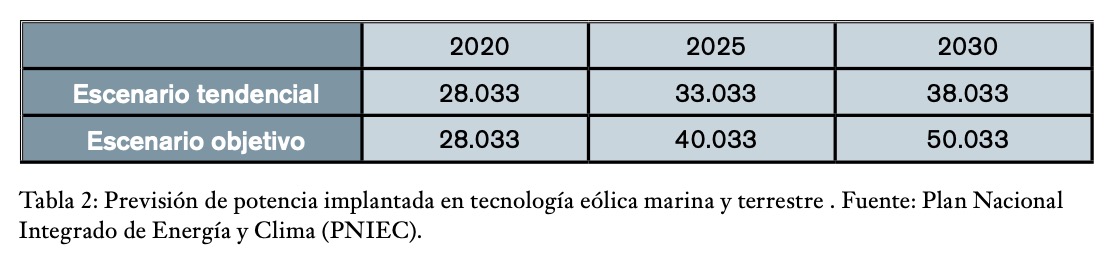 El PNIEC plantea dos escenarios, uno objetivo (que sería el que se ha de cumplir) y otro tendencial (considerando que la evolución de las políticas energéticas sigue la tendencia de los últimos años). En ambos casos la energía eólica tiene una evolución alcista, como se puede ver en la tabla 2.