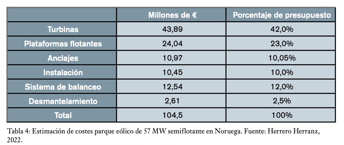 En esta línea, se debe citar el desglose que propone Herrero Herranz en su trabajo Análisis medioambiental y económico de la implantación de un parque eólico offshore en la costa de Noruega, para un parque eólico de potencia de 57 MW, formado por seis aerogeneradores de 9,5 MW y utilizando como tecnología la flotante semisumergible. En la tabla 4 se puede ver dicho desglose, en el que las turbinas suponen la partida más elevada.