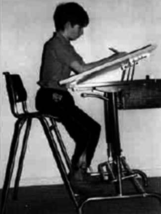 De modo orientativo, Mandal (1987) propuso la altura del usuario como referencia para la silla y el plano de trabajo, para lo que la altura de la silla tiene que ser un tercio de la altura de la persona y la del escritorio la mitad de esa misma dimensión (Mandal, 1987). Un mobiliario tipo Mandal se muestra en la figura 9.