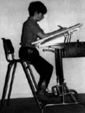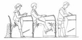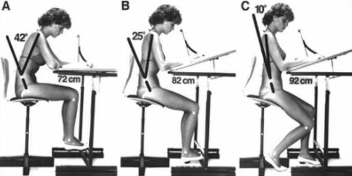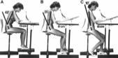 Para evaluar el efecto que un asiento inclinado hacia delante tiene en la flexión y en la curvatura de la espalda, Mandal llevó a cabo un experimento (Mandal, 1987). Para realizarlo, los participantes se colocaron en una estación de trabajo con un asiento y una superficie de trabajo de altura fija (figura 8). Sin embargo, los pies se colocaron en tres posiciones diferentes para simular diferentes alturas de trabajo, y el asiento y la superficie de trabajo se inclinaron. En primer lugar, los participantes se colocaron en la posición tradicional de ángulo recto (figura 8A), con lo cual el asiento y la superficie de trabajo se inclinaron gradualmente, y la posición de los pies se bajó, para simular un incremento de la altura del asiento y de la superficie de trabajo (figura 8B y C).