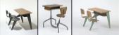 En la figura 6 se muestran distintos modelos de pupitre diseñados por el arquitecto francés Jean Prouvé en las décadas de 1930 y 1940. En estos diseños puede observarse esa tendencia hacia la funcionalidad y, además, suponen una transición entre el pupitre clásico y lo que serán los diseños de mobiliario a partir de la II Guerra Mundial. Aunque en ellos se mantienen el asiento y la mesa unidos, y el plano de trabajo sigue siendo inclinado, se trata de diseños mucho más sencillos. Cabe destacar la desaparición del banco en los pupitres bipersonales, evolucionando hacia asientos individuales.