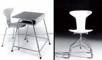 El diseño de mobiliario realizado por el arquitecto Arne Jacobsen en la década de 1950 para la escuela Munkegards (Dinamarca) es un ejemplo de estas nuevas tendencias (figura 7). Pese a no fabricarse desde finales de los años sesenta, el mobiliario de Jacobsen tuvo gran importancia. Por una parte, representó una ruptura con la idea de pupitre que venía fabricándose hasta entonces y, por otra, fue el punto de partida para una nueva idea de diseño escolar con unas características que siguen vigentes en la actualidad, como es la separación de la silla y la mesa, la idea de plano de trabajo horizontal y el empleo de tubos de acero como material. Tanto la silla como la mesa (figura 7A) estaban disponibles en tres tamaños y, además, había un modelo de silla con ruedas (figura 7B).