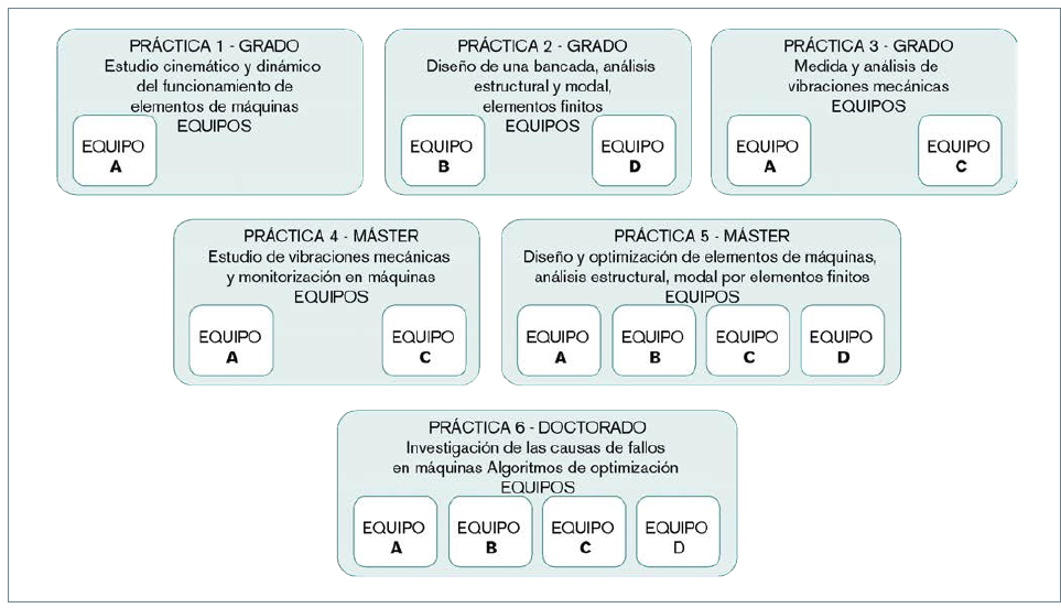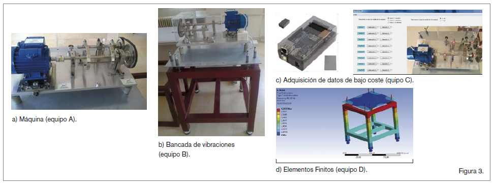 d) Estudio de vibraciones mecánicas y monitorización en máquinas (práctica 4, figura 4). Se estudian los diferentes fallos habituales en las máquinas ylas metodologías para lamedición de vibraciones mecánicas.El estudiante debe diseñar un sistema de monitorización de la máquina, realizar medicionesde vibraciones y estudiar las causas de estas. El análisis de los resultados obtenidos debe aplicarlos para el diseño de un plan de mantenimiento predictivo o preventivo. Esta práctica se desarrolla por estudiantes de máster.