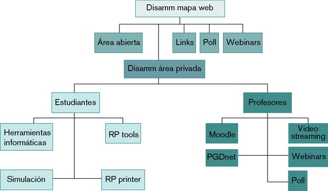 El alumno realiza diferentes actividades empleando las herramientas docentes que DISAMM pone a su disposición a través de la web (figura 5). Estas herramientas están a disposición de todos los estudiantes y de cualquier usuario autorizado. Existe una zona privada para los primeros en la que pueden realizar sus experiencias docentes de forma segura. El profesor interactúa con los estudiantes a través de diferentes recursos y aplicaciones informáticas: Moodle, PGDnet, Webinars, etc. Y existe un área abierta en la que cualquier persona puede acceder a toda lainformación públicaacercade las actividades de DISAMM. Dado que los usuarios (estudiantes, profesores y diferentes socios) no necesitan acceder al espacio físico de la instalación, se puede beneficiar un mayor número de estudiantes de la ETS de Ingeniería y Diseño Industrial, así como de otros centros de la Universidad Politécnica de Madrid y otras Universidades, centros de I + D + i y empresas.