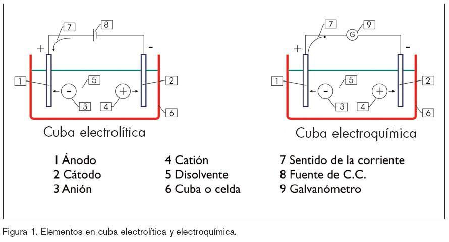 Como se sabe, ciertos compuestos o sustancias al disolverse en el agua se ionizan; si introducimos dos conductores metálicos e inertes, unidos a un generador de corriente continua se produce una reacción química. El proceso químico producido por la corriente eléctrica se llama electrolisis; el recipiente que contiene la disolución y los conductores, celda o cuba electrolítica; electrolito, la sustancia disuelta; el conductor unido al polo positivo, ánodo; el conductor unido al polo negativo, cátodo; los iones que se dirigen al polo positivo y cargados negativamente, aniones; y los iones que se dirigen al polo negativo, cargados positivamente, cationes.