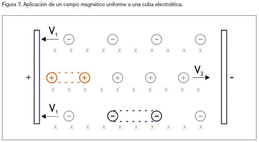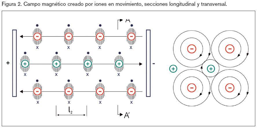En la sección transversal de la cuba se observa que a un ion rodeado de iones de signo contrario, le llegan las líneas de fuerza del campo magnético y cuya suma vectorial es cero; sin embargo, si observamos la cuba en sentido longitudinal apreciamos que cada ion origina un campo magnético debido al movimiento de los iones y que es del mismo sentido y dirección pero de valor variable en cada punto dependiendo de la posición de la carga.