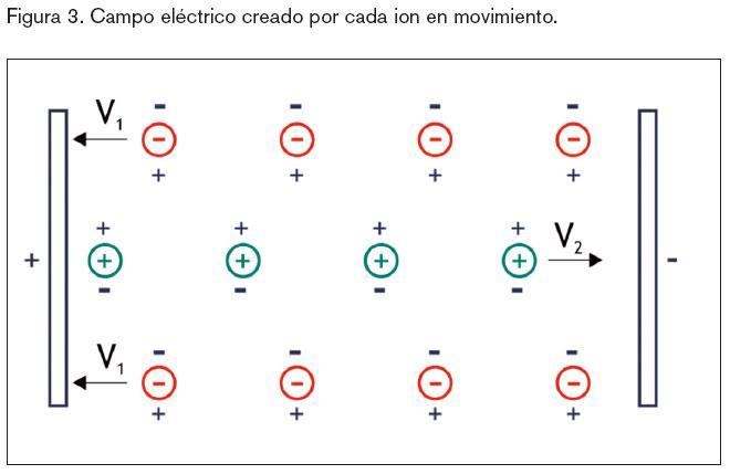 En sus movimientos los iones cortan las líneas de fuerza del campo magnético creando una fuerza electromotriz independiente del signo de su carga y cuya polaridad en cada ion sólo depende del sentido de su movimiento. Los iones no se pueden desplazar en sentido perpendicular a su trayectoria porque se lo impiden los de signo contrario. Pero se crea un desplazamiento de cargas que, como se aprecia en la figura 3, crea fuerza de repulsión entre iones de distinta carga que facilita el movimiento de los mismos; de aquí se desprende que aumente la intensidad en mayor proporción al aumentar la tensión entre los electrodos. En el efecto Hall, se desplazan las cargas en sentido transversal a su movimiento, bien sean iones o electrones, creando una pequeña intensidad de campo debida a la Fem. producida; en este caso se lo impiden los iones que circulan en sentido contrario y lo que ocasiona es que iones de signo distinto se repelen.