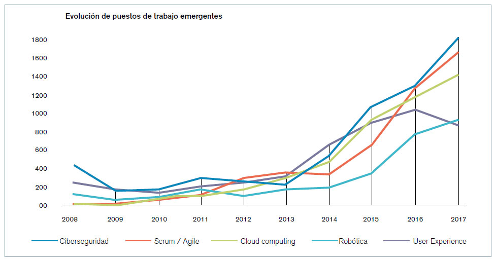 Todo ello entraña la necesidad de contar con nuevos perfiles. Entre la lista de los nuevos puestos emergentes más demandados se encuentran los de diseñador de software y web, programador de apps, desarrollador de Big Data y especialistas en Agile/Srum, cloud computing (computación en la nube), UX design y en ciberseguridad. En este sentido, el último informe de Infojobs señala que los puestos vacantes para estos últimos (ciberseguridad) asciende a unos 1.300, y el sueldo bruto medio es de 32.400 €. Sin embargo, todos estos perfiles son tan nuevos que no hay suficientes profesionales para cubrir la demanda del mercado laboral.