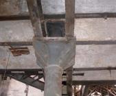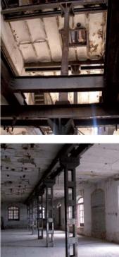 En la siguiente imagen podemos apreciar una de estas prolongaciones, con la particularidad de que se produce una variación en la tipología del pilar entre planta y planta. Puede apreciarse que la columna de fundición de la primera planta pasa a ser de láminas de acero empresilladas y roblonadas en la segunda, posiblemente, por tratarse esta última de parte de una ampliación del forjado entre la segunda y la tercera alturas, y de datación bastante posterior. Aparece igualmente esta tipología en el edificio de la alcoholera anexa a las instalaciones, que pasamos a describir.