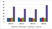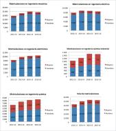 En lo que respecta a la rama de electrónica, el 13,86% del total de egresados fueron mujeres en 2013; el 14,32% en 2014; el 11,24% en 2015, y el 12,73% en 2016. Por su parte, el porcentaje vuelve a subir cuando nos referimos a la rama de química industrial, llegando incluso a superar ligeramente el número de alumnas egresadas al de sus compañeros en dos cursos: 2012-13, con el 52,17%, y en 2015-16, con el 57,56% del total. En el curso 2014-15 fue del 44,55%, y en 2014-15, las mujeres supusieron el 43,29% de los egresados. En cifras absolutas, la suma de las cuatro ramas supone un total de 5.436 alumnos egresados en 2016, hombres y mujeres, en los citados grados (3.148 en mecánica, 1.079 en electricidad, 1.037 en electrónica y 172 en química).