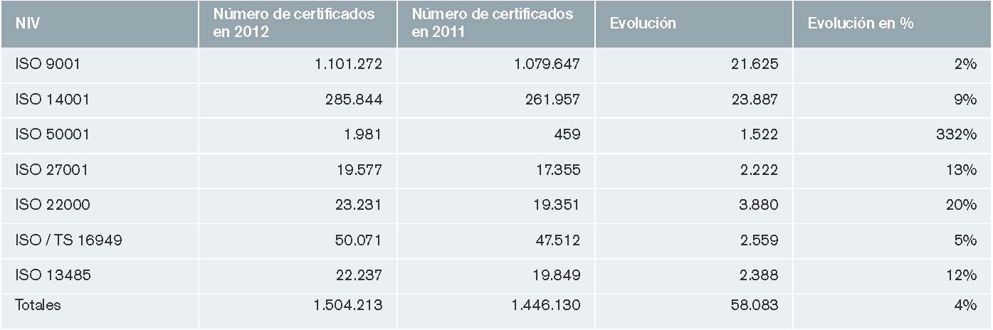 A continuación, en la tabla 2 se muestra el resumen de las estadísticas globales obtenida en ISO Survey 2012. En general, cabe indicar que los resultados revelan un crecimiento notable en todos los ámbitos de las certificaciones NIV ISO, mostrando un ligero aumento en comparación con el año 2011.