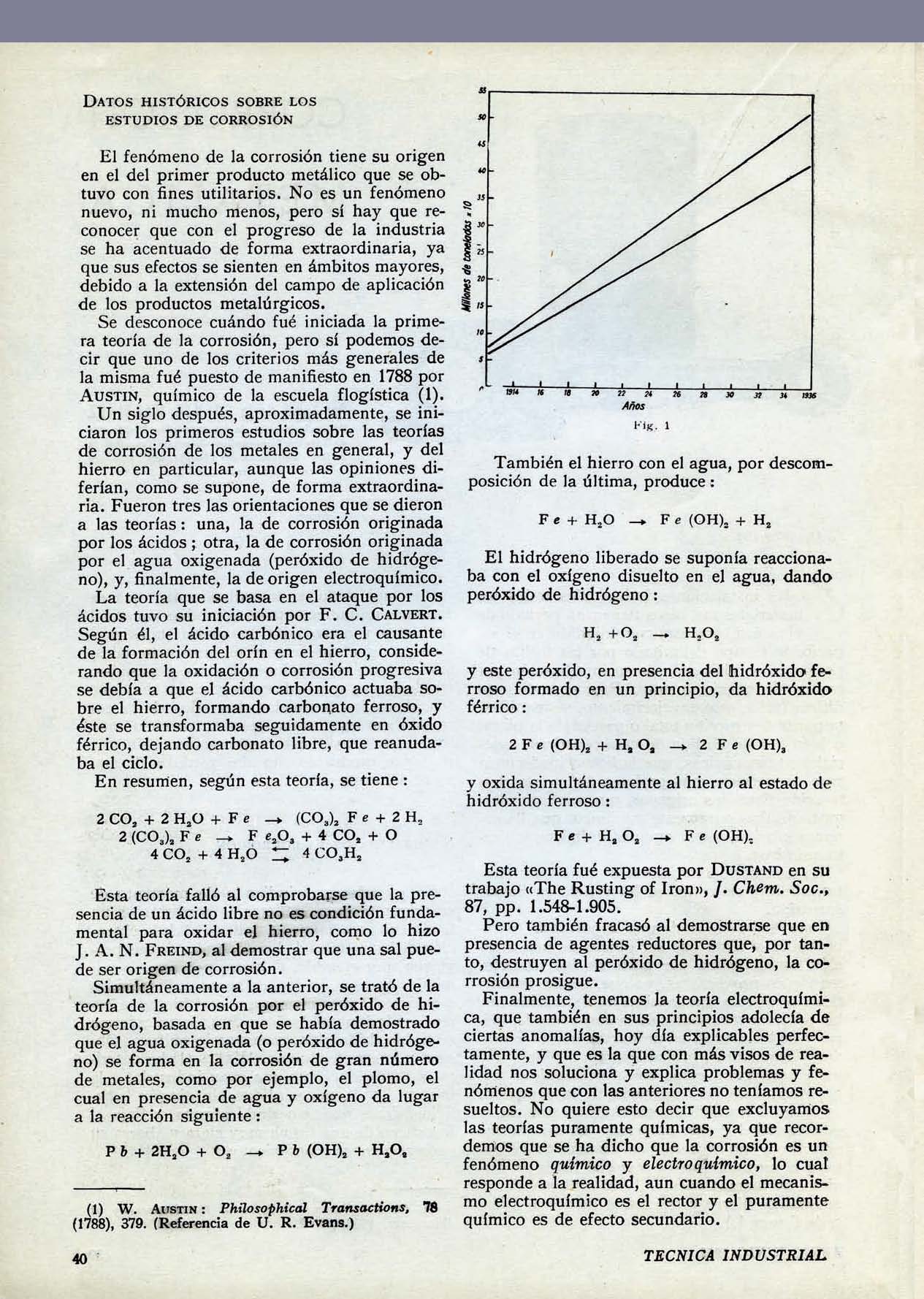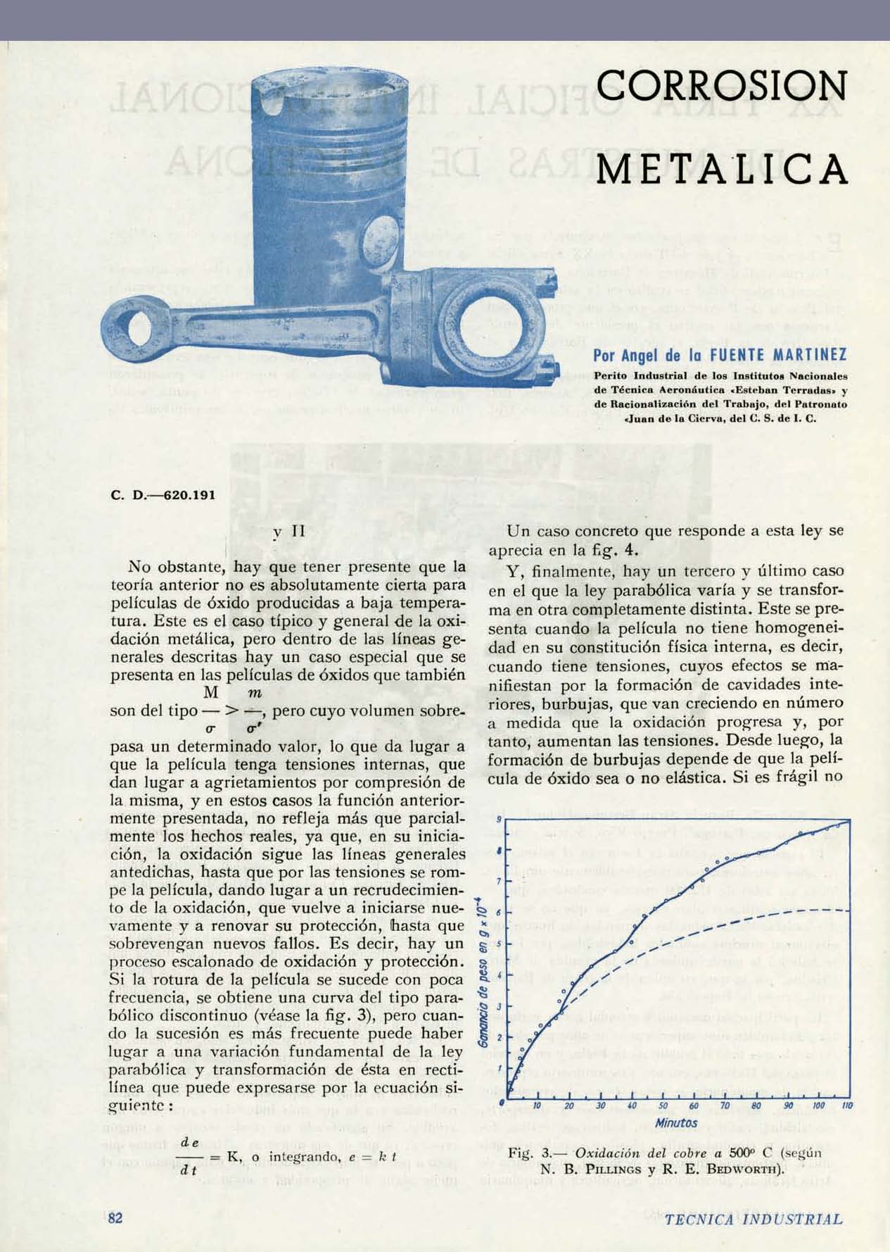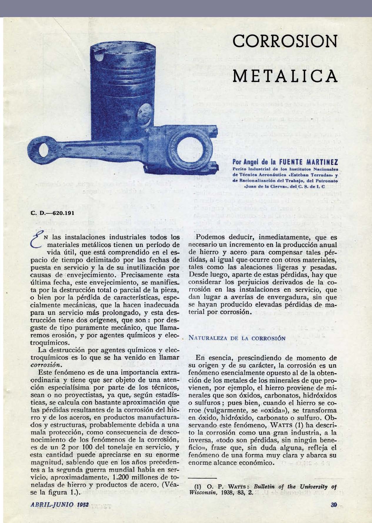 Para conmemorar el sexagésimo aniversario de Técnica Industrial, durante 2012 reproduciremos cuatro artículos publicados en 1952. Este segundo artículo es Corrosión metálica, de Ángel de la Fuente Martínez, perito industrial de los Institutos Nacionales de Técnica Aeronáutica Esteban Terradas y de Racionalización del Trabajo del Patronato Juan de la Cierva del CSIC, publicado en dos partes. El texto se acompaña de un comentario técnico de Gabriel Esteller Lores.