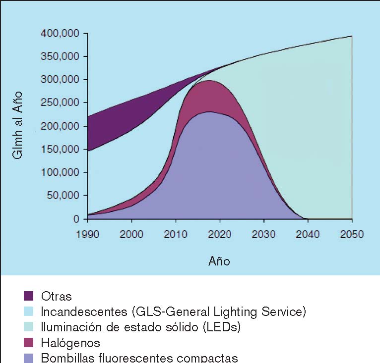 Así, un estudio publicado por el UK Energy Research Centre en Reino Unido ha mostrado mediante el uso de modelos que utilizar LED de forma generalizada podría suponer el 80% de reducción en el año 2031 y que este ahorro podría incrementarse hasta el 87% en el año 2050, una vez que las LED se conviertan en la única tecnología disponible en el mercado. Esto significa que de los 17.500 GWh que se utilizan en la actualidad en luces domésticas e industriales se podrían reducir hasta un total de 2.000.