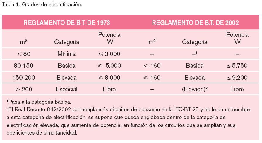 La regulación actual y la de 1973 tienen sus coincidencias, pero varían los coeficientes de simultaneidad de los diferentes circuitos receptores y las potencias mínimas de algunos tipos de consumos específicos.