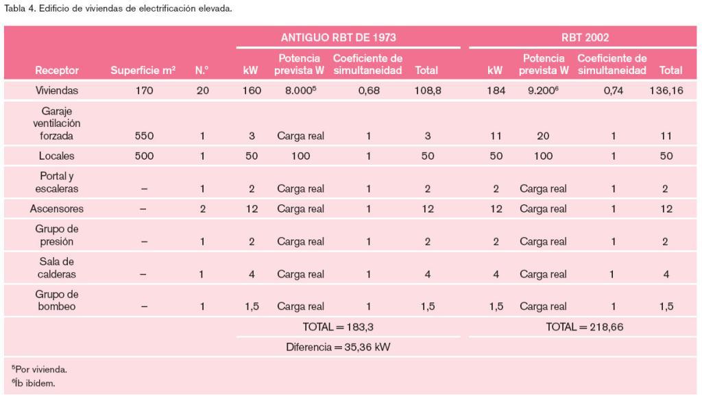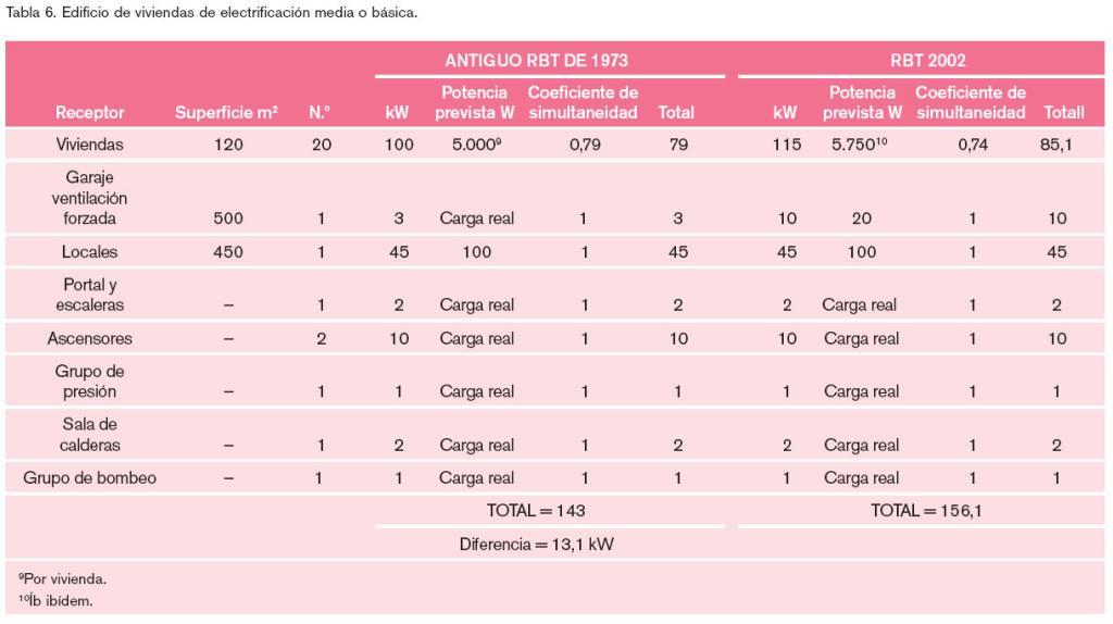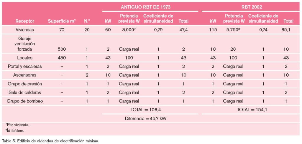 Como ya se ha dicho previamente en el Reglamento de 2002, se mantiene la previsión general de 100 W/m2 con un mínimo de 3.450 W por local, independientemente de su superficie. En el Reglamento de 1973 la potencia mínima por local era de 5.000 W, sin tener en cuenta la superficie, y el coeficiente de simultaneidad se establecía en la unidad. Dado que el consumo de energía eléctrica va en aumento, esta disminución de la previsión de potencia mínima por local que realiza el Reglamento de 2002 no resulta explicable.