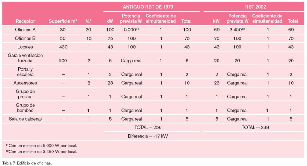 El saldo resultante según la reglamentación actual es negativo. El anterior Reglamento era mas exigente que el actual en cuanto a la previsión de potencia mínima de las oficinas pequeñas; por este motivo la nueva potencia calculada resulta inferior. Si no se tiene en cuenta la potencia del garaje, la previsión es de 219 kW según el Reglamento de 2002 y 250 kW de acuerdo con el Reglamento de 1973. El resultado da 31 kW menos haciendo la estimación con la nueva norma en vez de con la anterior, lo que parece un contrasentido, pues el uso de la electricidad es hoy día mucho más intensivo que en 1973. El resultado final no queda tan descompensado porque la previsión de potencia del garaje, calculada de acuerdo con el Reglamento de 2002, es mucho mayor. Los resultados se encuentran en la tabla 7.