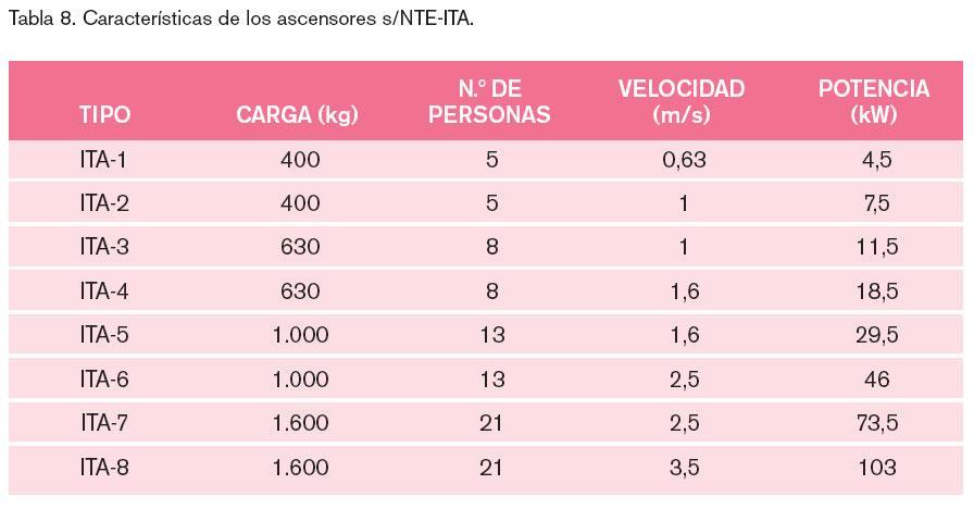 Para facilitar el cálculo de la potencia de los ascensores, se incluyen en la tabla 8 parte de los datos de la norma tecnológica de la edificación NTE-ITA. Es muy raro encontrar ascensores de tipo superior al ITA-4 en edificios de viviendas donde normalmente se instalan los tipos uno y dos. Los ascensores de tipos superiores son más frecuentes en los edificios de oficinas o centros comerciales.
