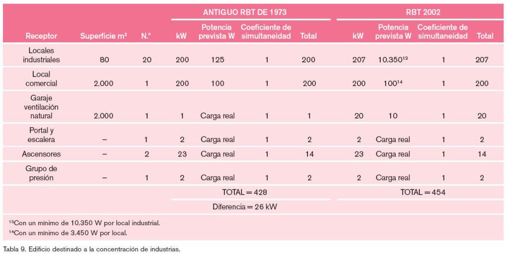 Las diferencias entre los resultados obtenidos obedecen a la mayor potencia pre-vista para el garaje y a la potencia mínima establecida para cada local industrial independientemente de su superficie, establecida en 10.350 W por local. Los resultados calculados se pueden observar en la tabla 9. La potencia es un 6% mayor en el cálculo realizado de acuerdo con el nuevo Reglamento de 2002, pues al aplicar una potencia mínima por local, independientemente de la superficie, aumenta el total del inmueble.