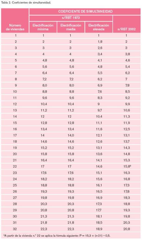 Llama la atención que los coeficientes de los grados de electrificación medio y mínimo del antiguo Reglamento de 1973 sean más altos que los del Reglamento de 2002 y que los coeficientes para las viviendas de electrificación elevada sean más bajos. Se mantiene de esta forma, en el Reglamento de 2002, un solo coeficiente de simultaneidad de valor intermedio entre los dos que preconizaba el anterior Reglamento de 1973.