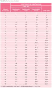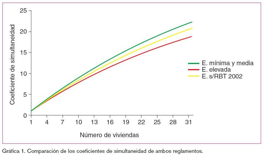 Los coeficientes de simultaneidad previstos en ambos reglamentos se han colocado en forma de tabla y representado gráficamente con el fin de facilitar una comparación entre ambos (tabla 2).