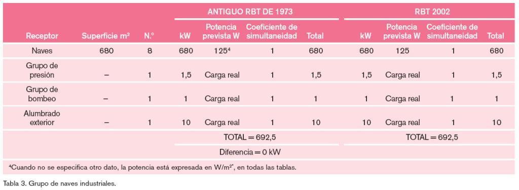 Como primer supuesto, se plantea la previsión de potencia de un grupo de naves industriales que cuentan con un grupo de presión común que les suministra agua potable, un grupo de bombeo de agua común para todas las naves y un alumbrado exterior de la calle particular donde se encuentran. La potencia será la que se expresa en la tabla 3. La previsión de potencias en este caso es idéntica independientemente de que el cálculo se realice en base a cualquiera de los dos reglamentos.