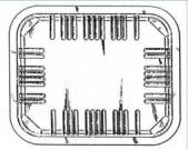 Consiste en un envase para alimentos, caracterizado por ser una especie de ban-deja, de configuración básicamente troncopiramidal, rectangular, divergente hacia su embocadura y con sus aristas verticales acusadamente redondeadas, que en correspondencia con dicha embocadura presenta una amplia pestaña perimetral, incluida en su mismo plano y a través de la que recibe una lámina de cierre. Presenta, además, sus vértices inferiores truncados, definiéndose para cada uno de ellos un amplio facetado plano, en forma de sector circular, con tendencia al triángulo, a la vez que en cada una de sus caras laterales aparecen una pluralidad de acanaladuras en media caña, perpendiculares a la arista inferior correspondiente, también redondeada y a través de la que se prolongan hacia la base del cuerpo, en un tramo de amplitud ligeramente superior a la altura de la pared lateral. Forman estas acanaladuras grupos dentro de los cuales éstas definen estrechas aristas redondeadas, a la vez que entre los grupos se definen estrechas franjas lisas, y decrece progresivamente el número de acanaladuras que participan en cada grupo desde el punto medio de cada cara a las zonas extremas de la misma.