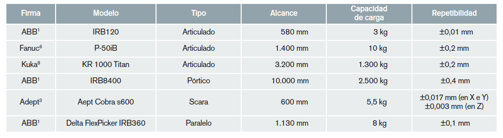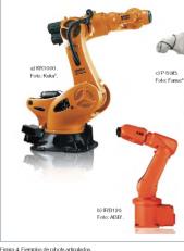 De entre todos los tipos de robots, el más extendido por ser el más escalable y el que se adapta a un mayor número de aplicaciones es el robot articulado. La figura 4 muestra diferentes robots comer-ciales de este tipo: a) un robot de gran-des dimensiones con una de las mayores capacidades de carga del mercado, b) uno de pequeño tamaño y c) un robot de pin-tura. Los robots cartesianos se utilizan en aplicaciones específicas y en manipu-lación de grandes cargas dentro de gran-des volúmenes (tipo pórtico). Los robots Scara y los paralelos de tipo Delta se uti-lizan en operaciones que requieran la manipulación rápida de pequeñas cargas.
